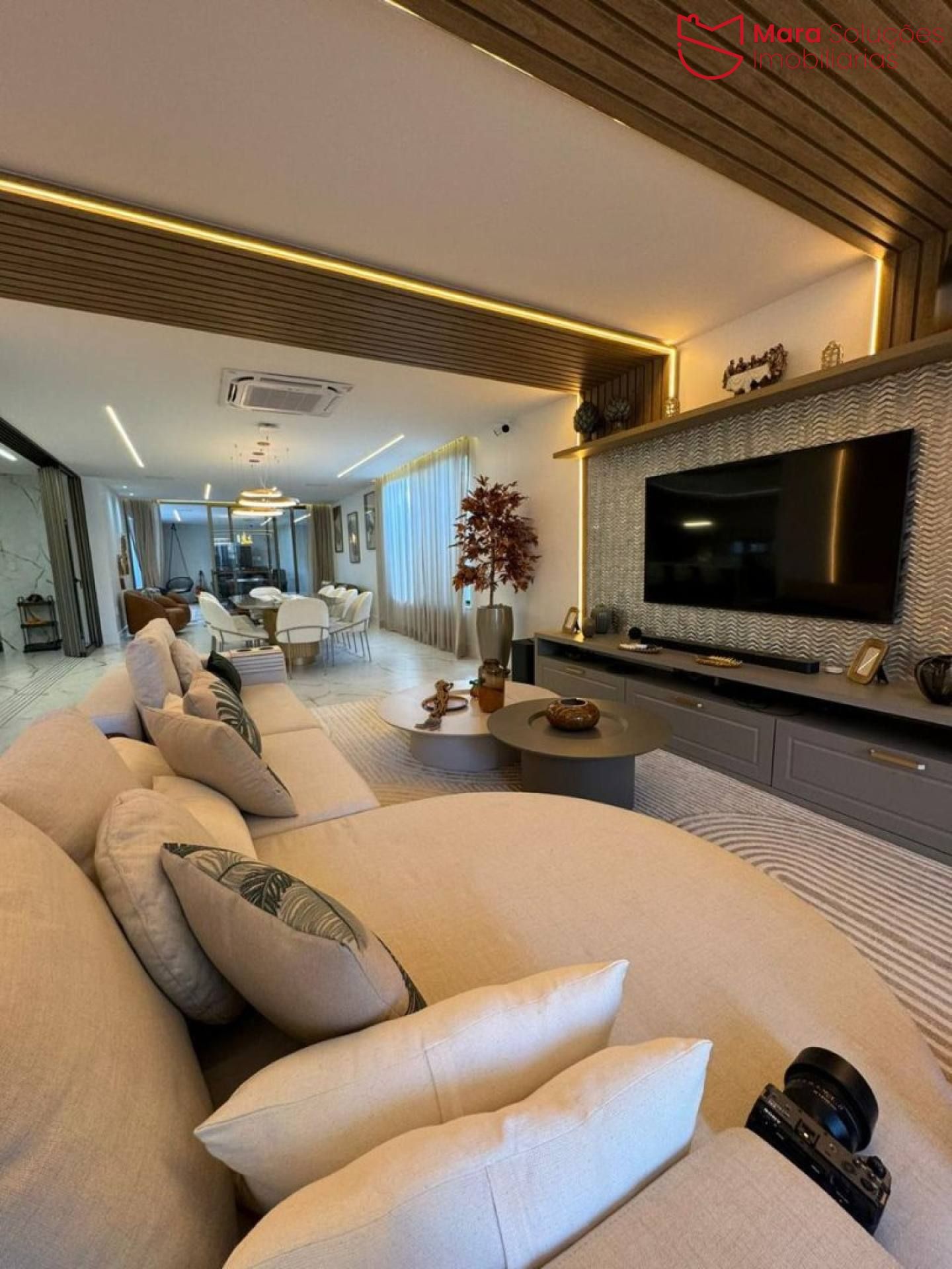Sala ampla com pé direito alto, ambientes integrados e iluminação natural que valorizam cada espaço, criando um clima acolhedor e convidativo.